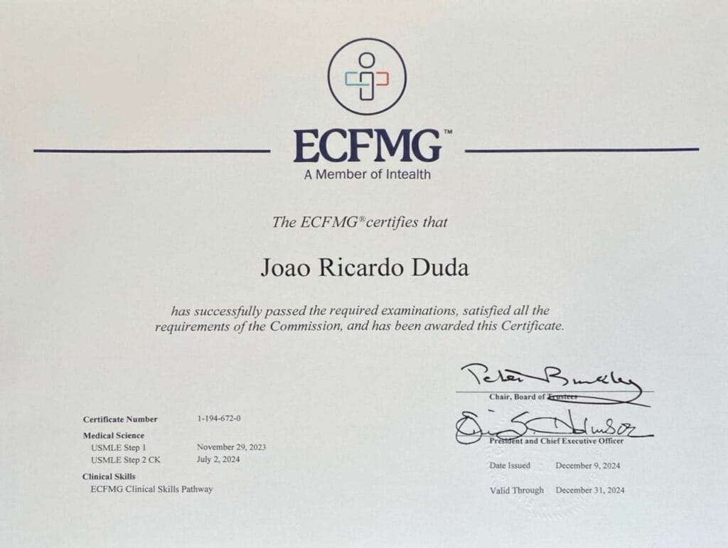 • USMLE/ECFMG Certified: Diploma Médico Validado nos EUA- 2024;